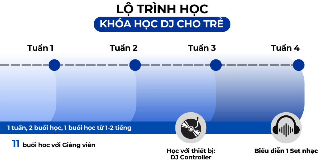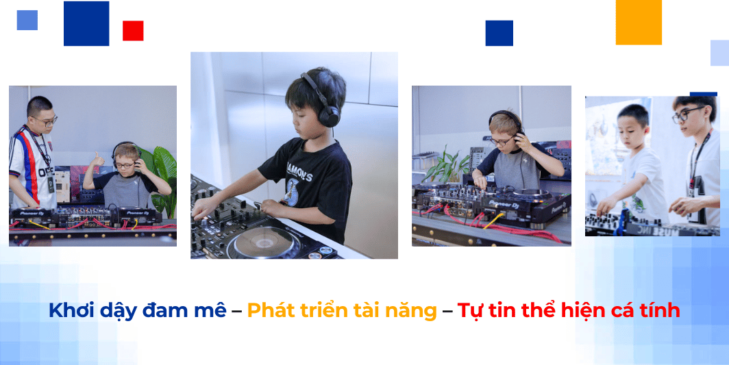Với giáo trình được xây dựng bài bản và dễ hiểu, khoá học mang đến cho trẻ từ 6 tuổi đến 14 tuổi một môi trường học tập nghệ thuật hiện đại, năng động và đầy cảm hứng. Dưới sự hướng dẫn trực tiếp từ các DJ chuyên nghiệp và có kinh nghiệm giảng dạy, các bé sẽ được làm quen với thiết bị DJ thực tế, học cách mix nhạc, cảm nhịp, và xây dựng set nhạc riêng của mình.
