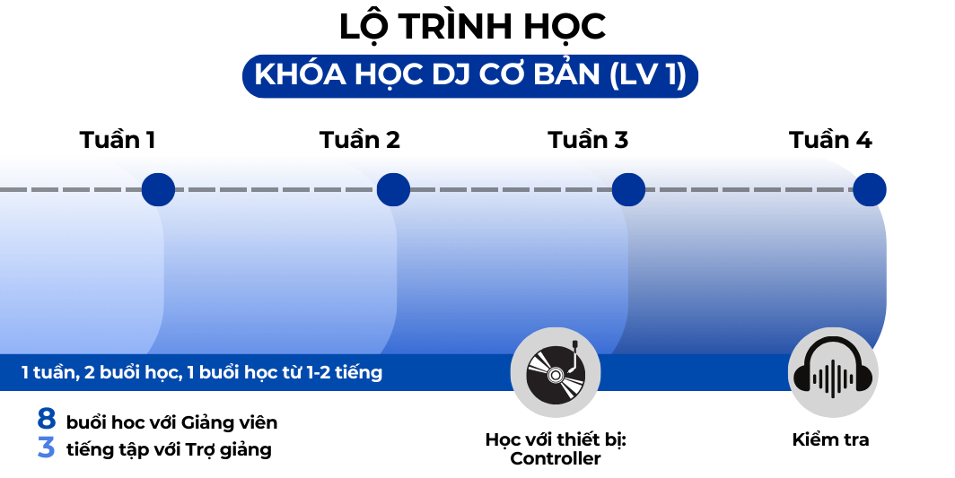 Lộ trình được thiết kế dành riêng cho những ai chưa có kinh nghiệm, khóa học này sẽ giúp bạn làm quen với thiết bị DJ, những kỹ thuật mix nhạc cơ bản, hiểu rõ về cấu trúc bài hát, nhịp điệu và cách tạo nên một set nhạc hoàn chỉn. Với sự hướng dẫn tận tâm từ giảng viên có kinh nghiệm trên 5 năm trong ngành, bạn sẽ được học lý thuyết song song với thực hành. Sau khóa học bạn có thể học khoá nâng cao và khoá chuyên nghiệp để theo đuổi đam mê của mình.